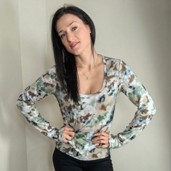 Podkreśl swój wyjątkowy styl z tą efektowną bluzką w ciekawym princie. Połączenie odcieni beżu, zieleni i bieli tworzy ciekawy wzór, który przyciąga uwagę.