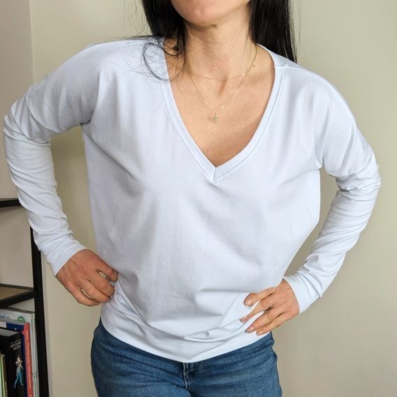 Materiał bluzki: dzianina bawełniana SINGLE (bawełna 97% elastan 3%), elastyczna - uciąga się 8-10cm na obwodzie, miękka i miła w dotyku