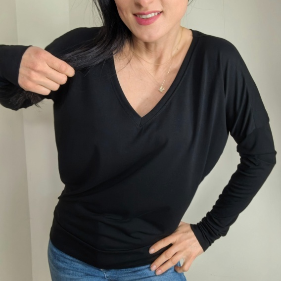 Materiał bluzki: dzianina bawełniana SINGLE (bawełna 97% elastan 3%), elastyczna - uciąga się 8-10cm na obwodzie, miękka i miła w dotyku