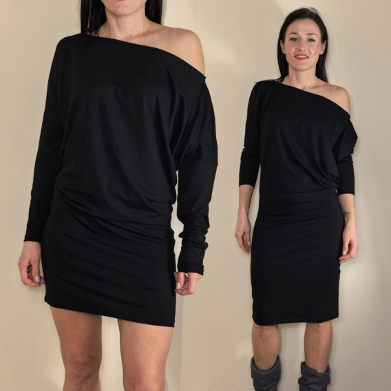 • Fason: dopasowany z luźną górą i szerokim dekoltem typu łódka. Sukienka 'trzyma się' na biodrach - musi być dopasowana w tym miejscu, nadmiar materiału z górnej części swobodnie opada zakrywając talię